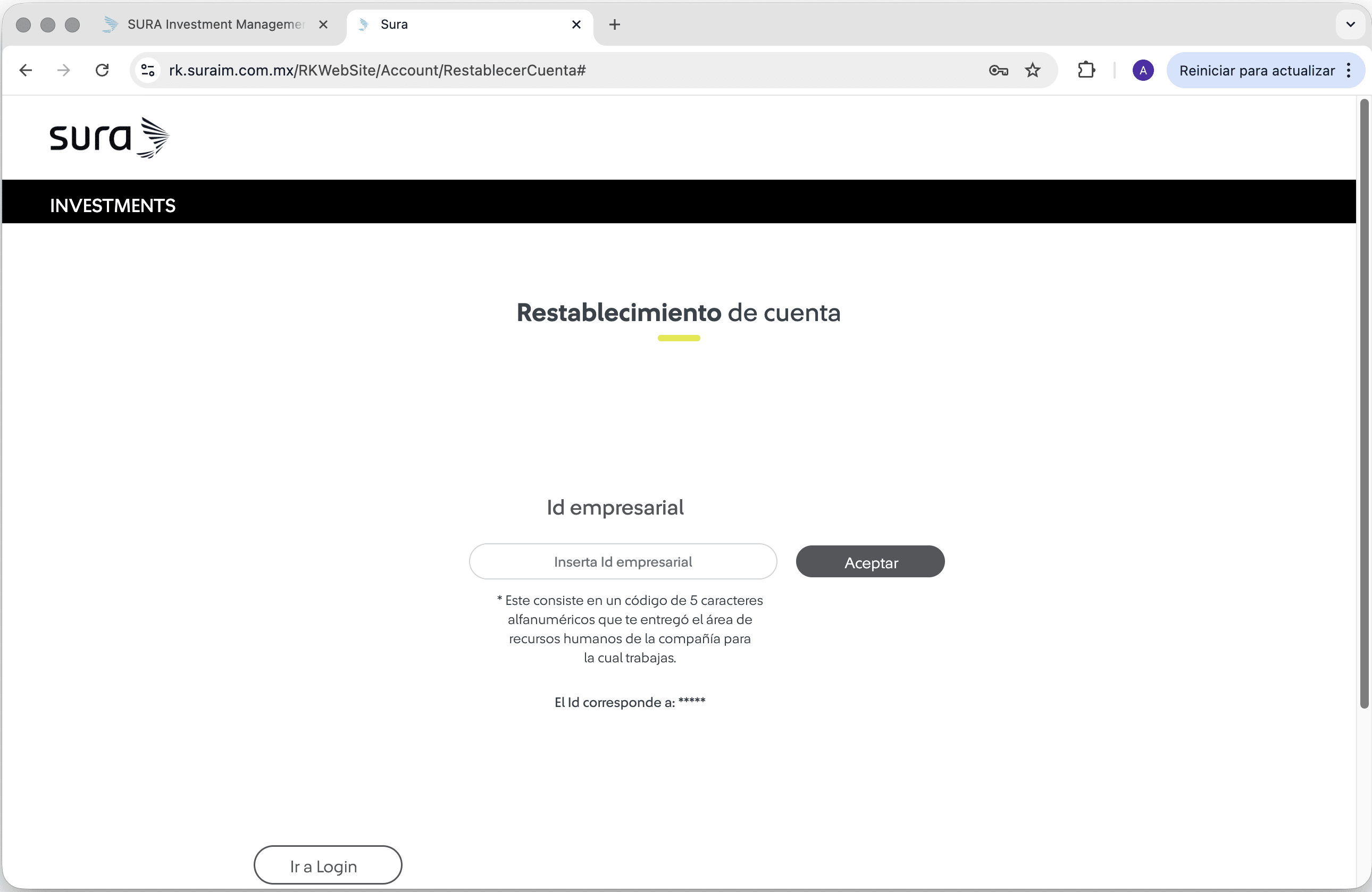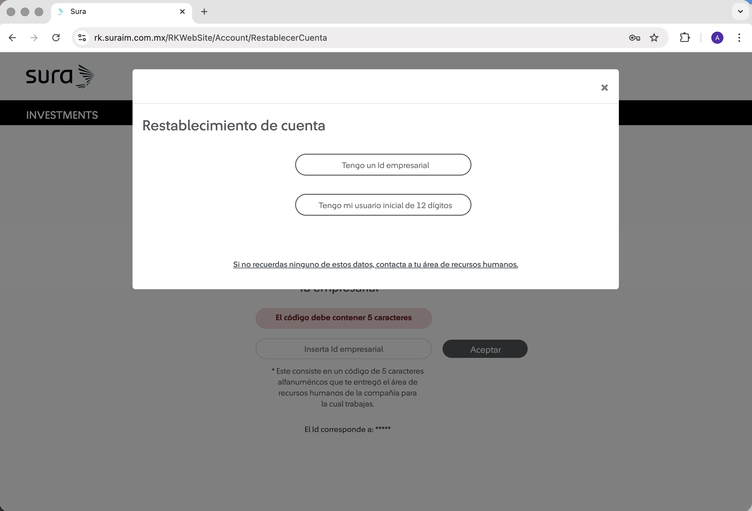 | 5 Elige la opción que tengas disponible ("Tengo un Id Empresarial" o "Tengo mi usuario inicial de 12 dígitos". ![]() Tip: Si tu usuario corresponde a un correo, pero en realidad cuentas con uno de 12 dígitos, elige la opción “Tengo mi usuario inicial de 12 dígitos”. En caso de que tu acceso sea mediante un código único, selecciona “Tengo una Id empresarial”. Si no recuerdas ninguno de estos datos contacta a tu área de recursos humanos. | 6 Introduce tu usuario de 12 dígitos y tu contraseña original, luego haz clic en el botón "Enviar". ![]() |