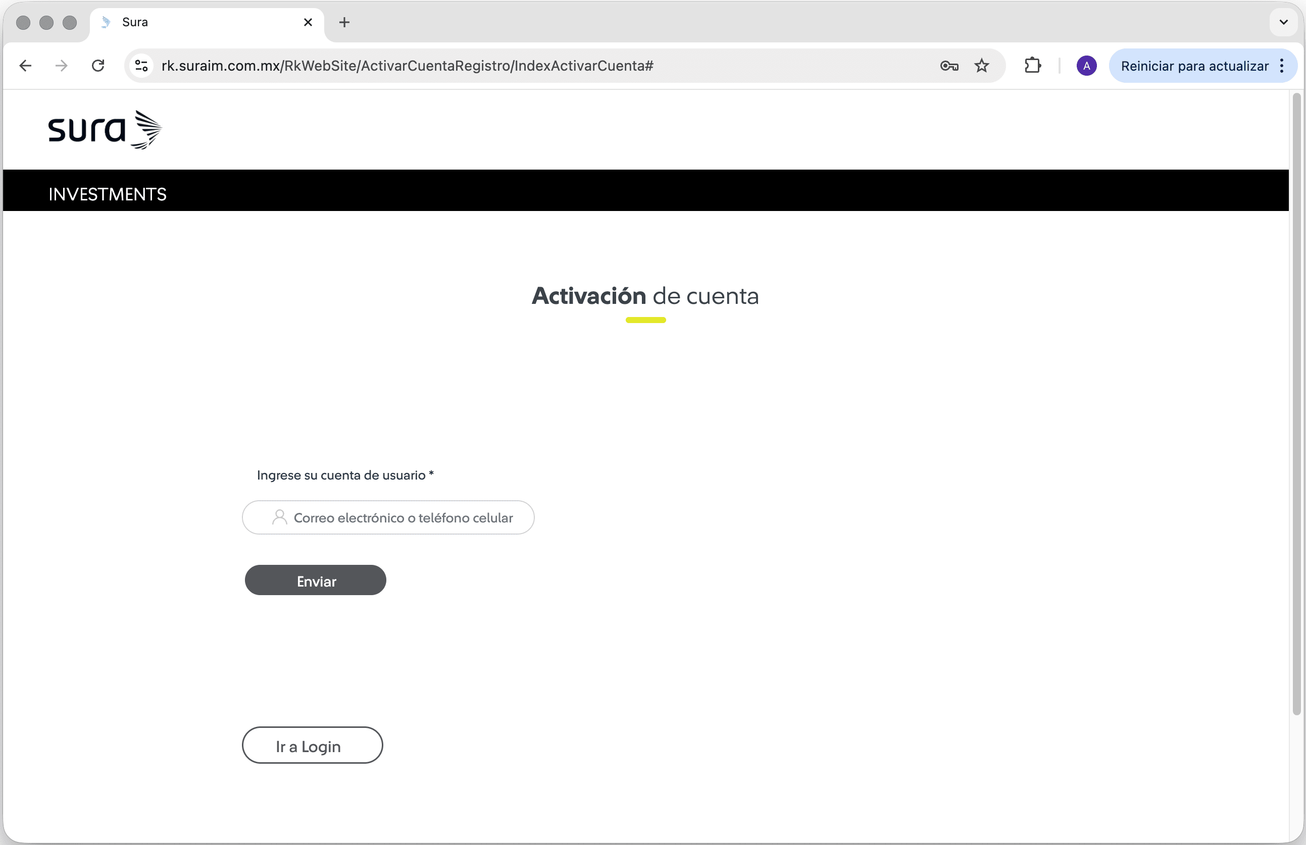 | 3 Clic en el botón "Activar cuenta para completar mi registro". ![]() | 4 Ingresa tu usuario de correo o teléfono celular, luego haz clic en el botón "Enviar". ![]() |