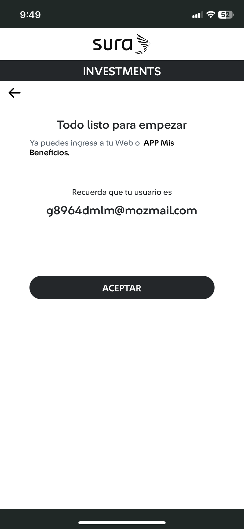 | 5 Se mostrará el mensaje "Todo listo para empezar". Da tab en el botón "Aceptar", e inicia sesión en la Web de Mis Beneficios con tu usuario ya sea correo o número de celular.