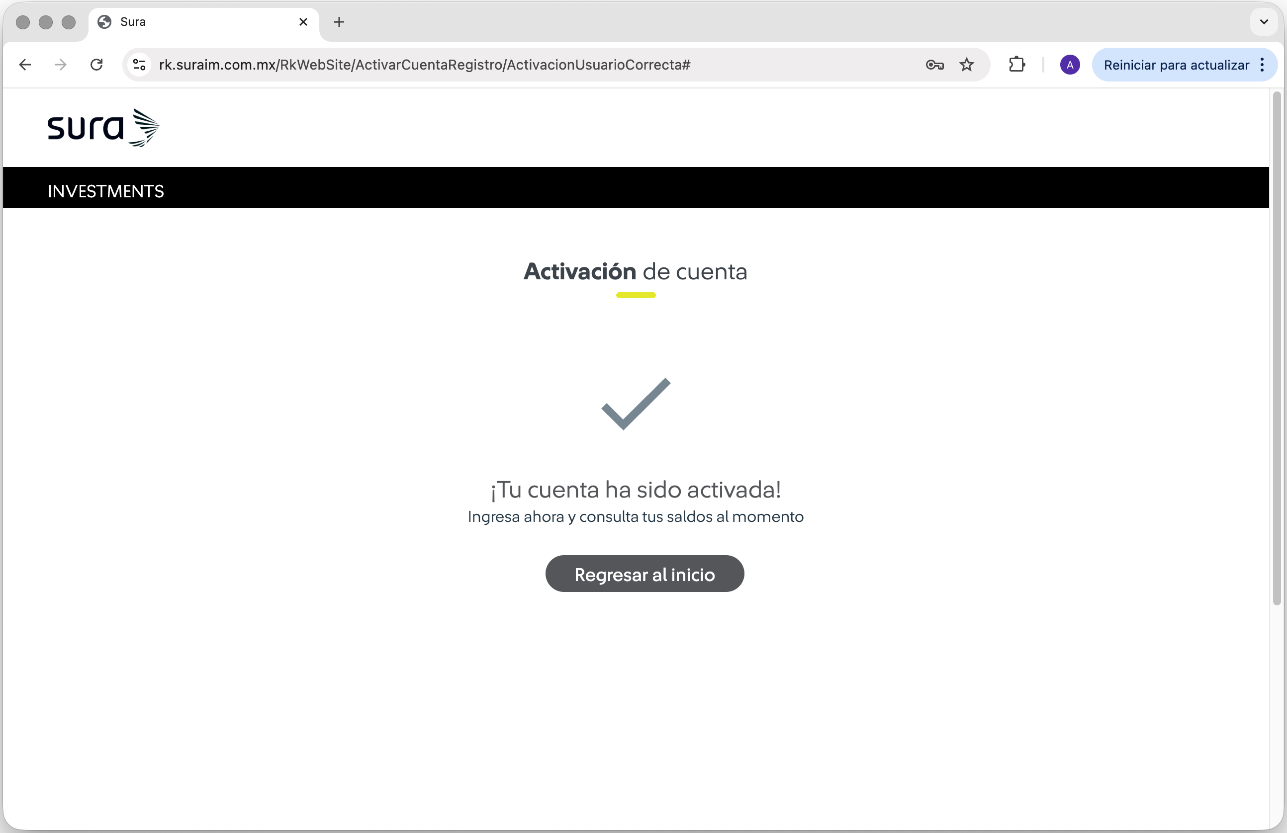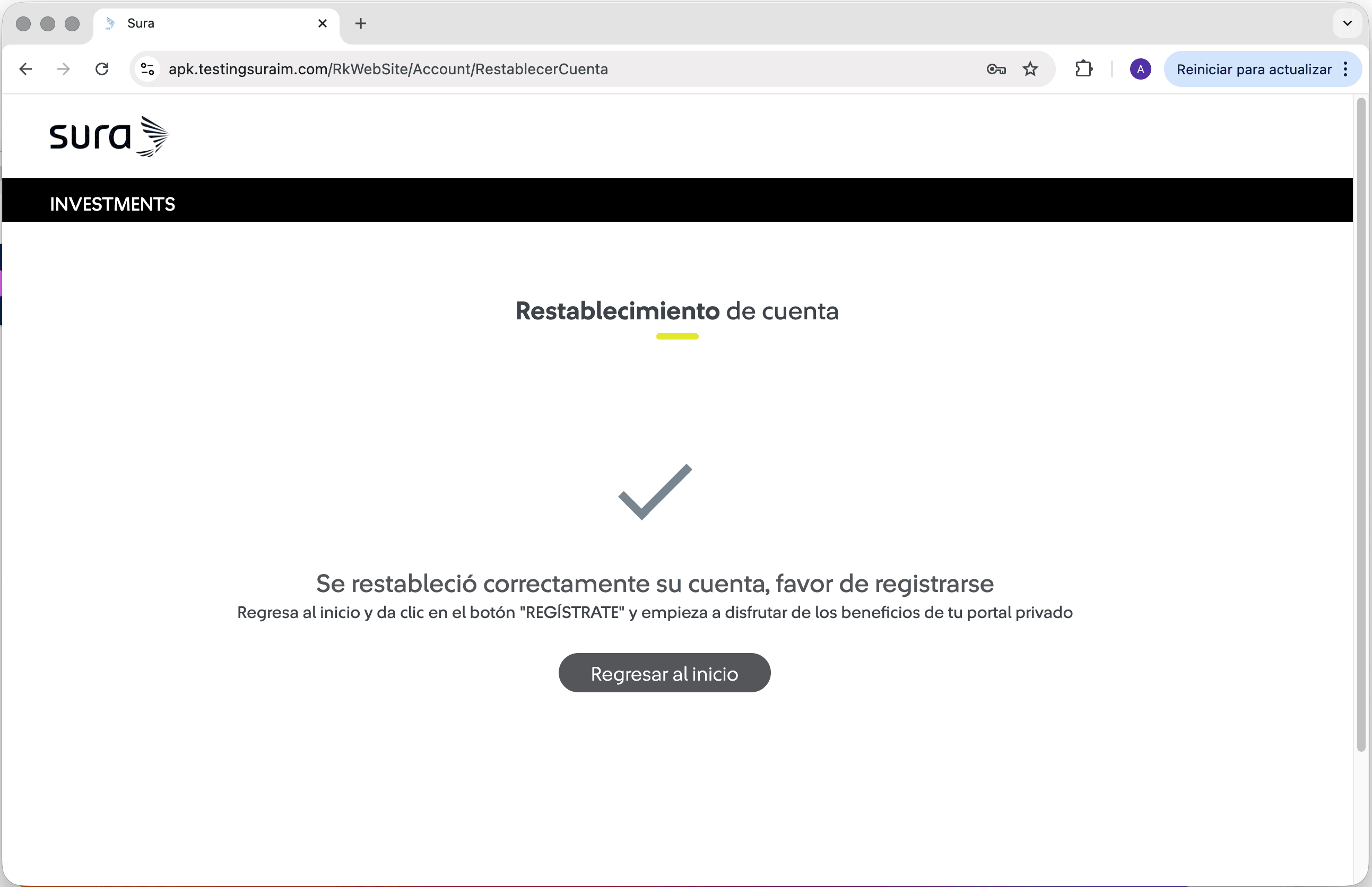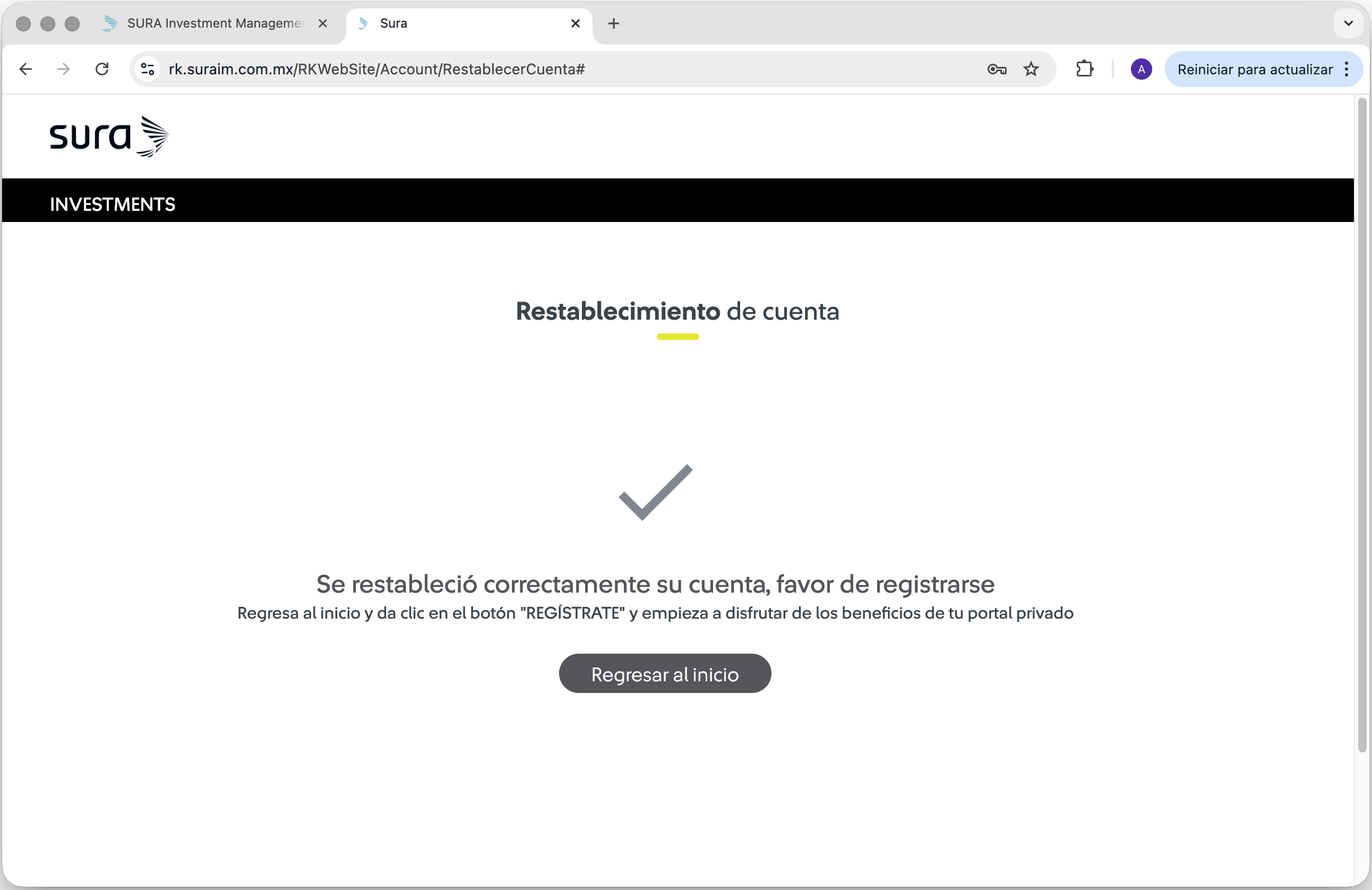 | 9 Se mostrará el mensaje "Se restableció correctamente su cuenta, favor de registrarse". Da clic en el botón "Regresar al inicio", e inicia sesión en la Web de Mis Beneficios con tu nuevo usuario ya sea correo o número de celular. |