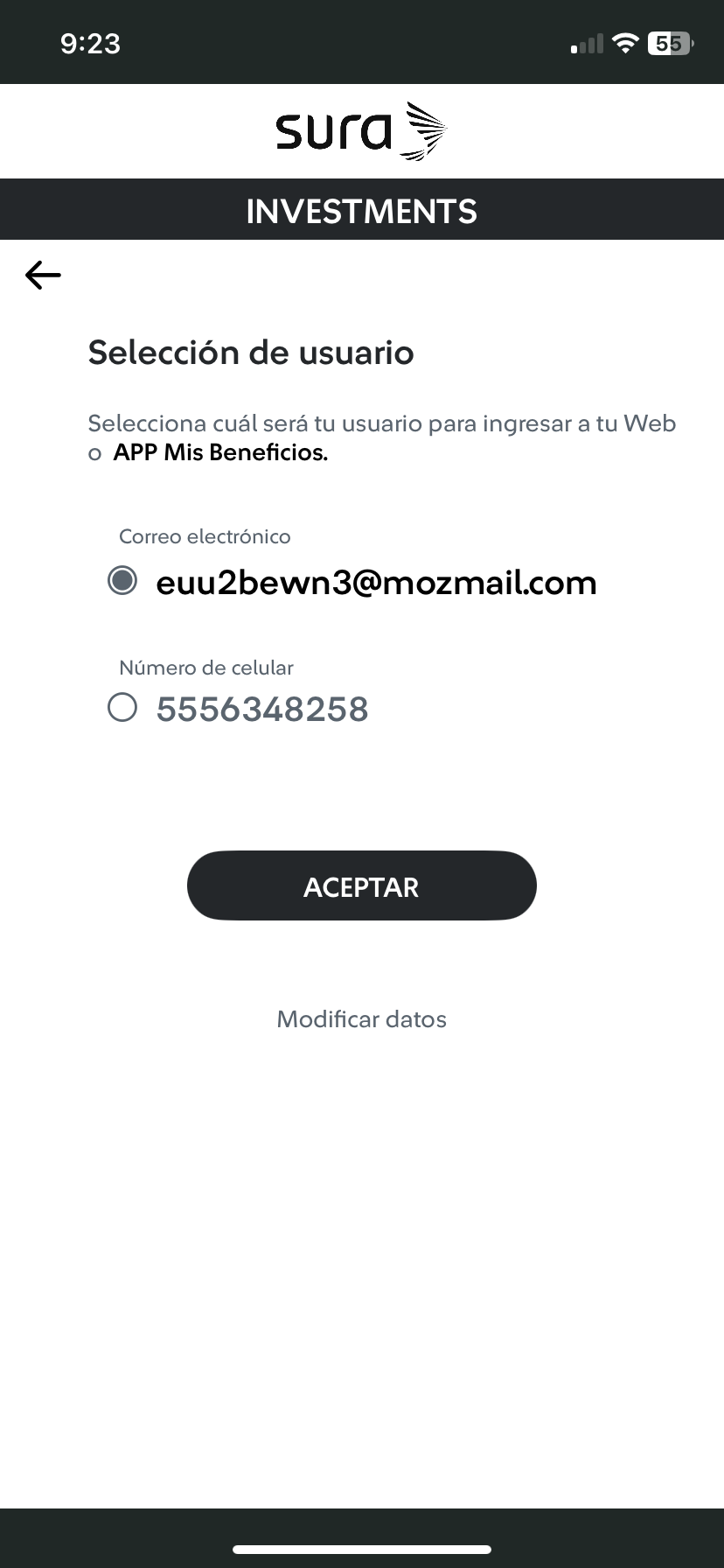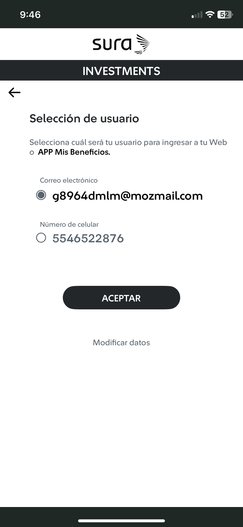 | 1 Ingresa tu correo electrónico y teléfono celular, luego haz tab en el botón "Siguiente". ![]() | 2 Selecciona el usuario con el que deseas ingresar a tu App o Web Mis Beneficios, luego haz tab en el botón "Aceptar". ![]() |