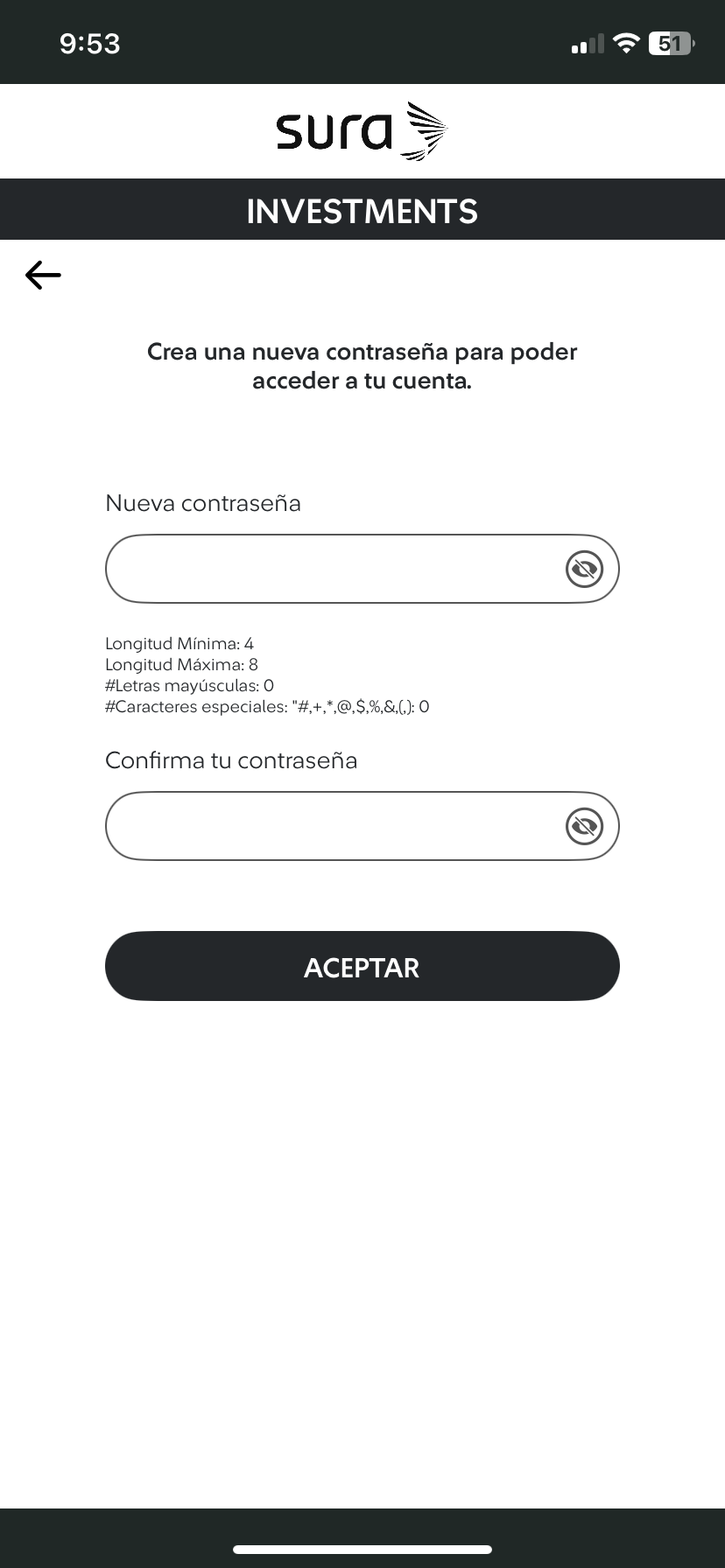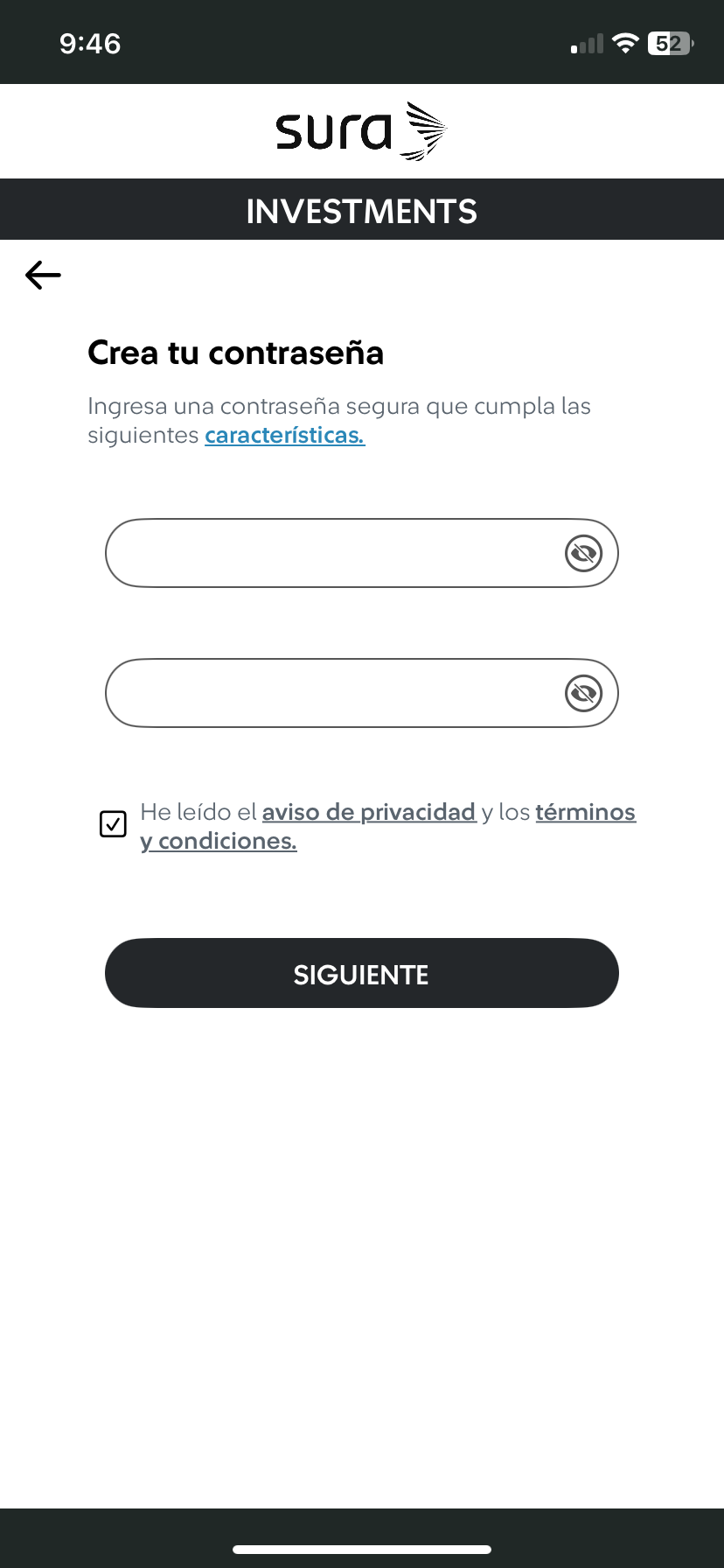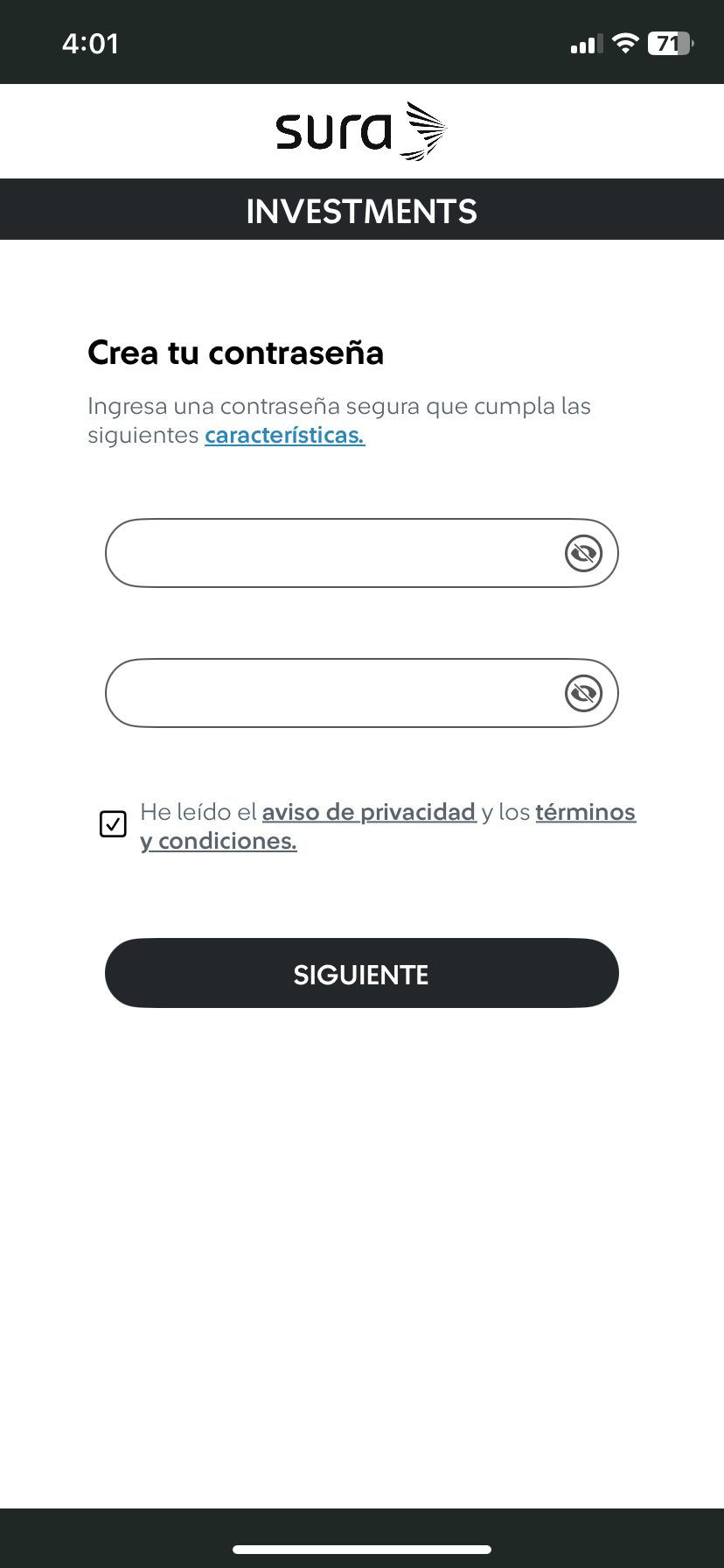 | 3 Ingresa y confirma tu contraseña, además, de "Aceptar los términos y condiciones".