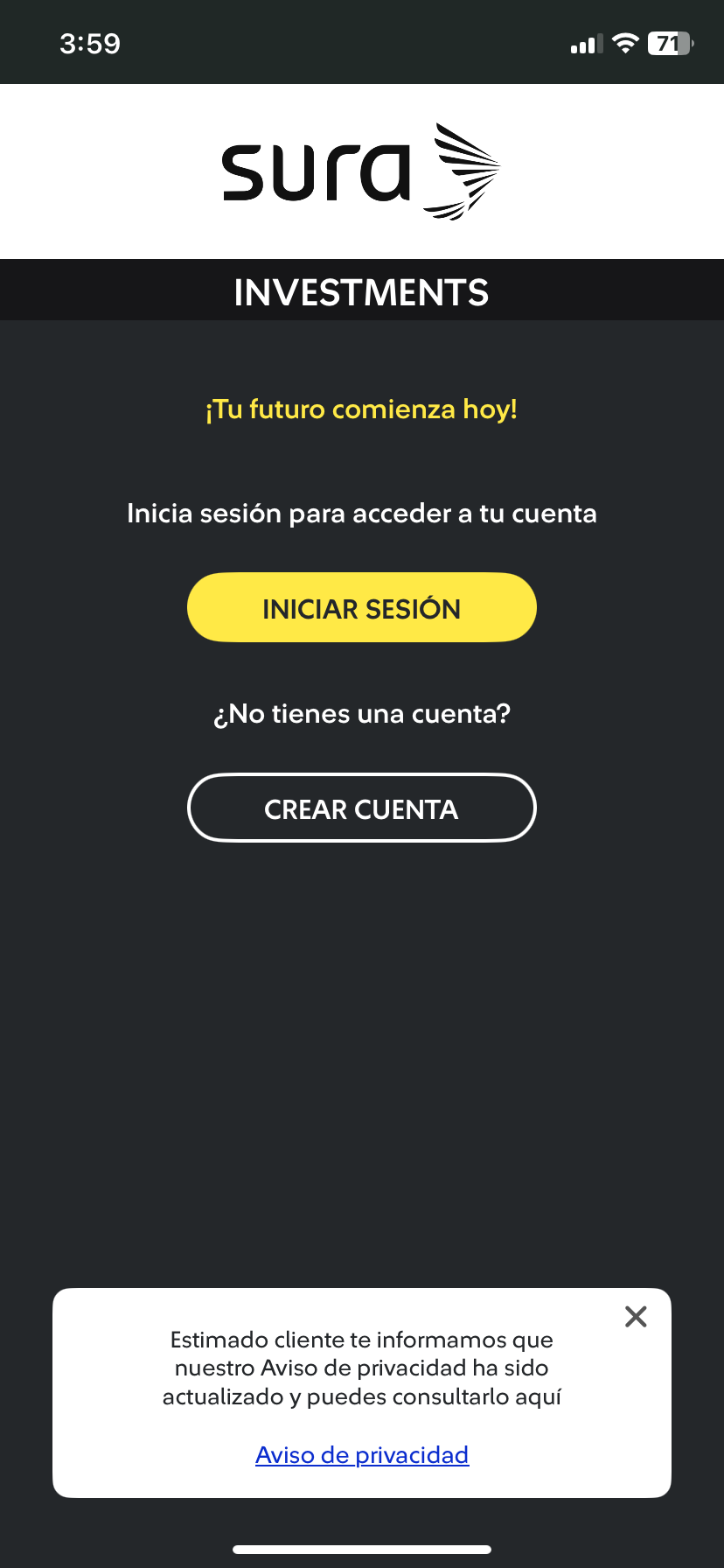 | 3 Dar tab en el botón "Crear cuenta". Tip: Asegúrate de otorgar los permisos de geolocalización a la app. Si no puedes tocar el botón Crear cuenta, es posible que la geolocalización esté desactivada en tu dispositivo. Solo necesitas activarla. Te invitamos a revisar la sección Geolocalización en la parte inferior de esta página para ver cómo hacerlo. |