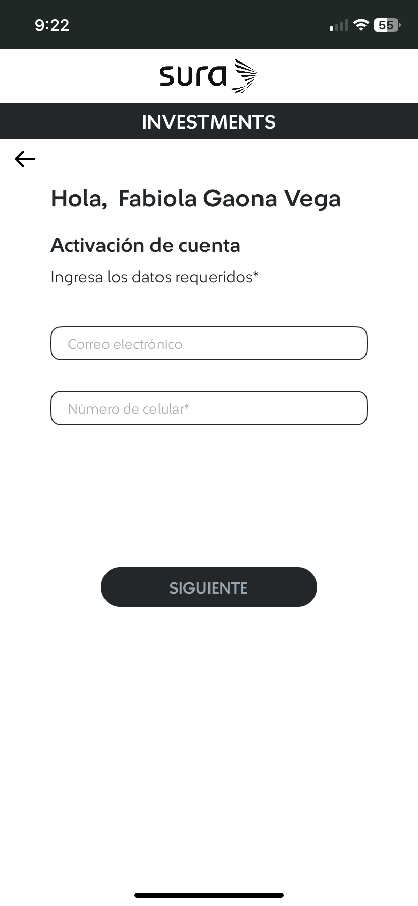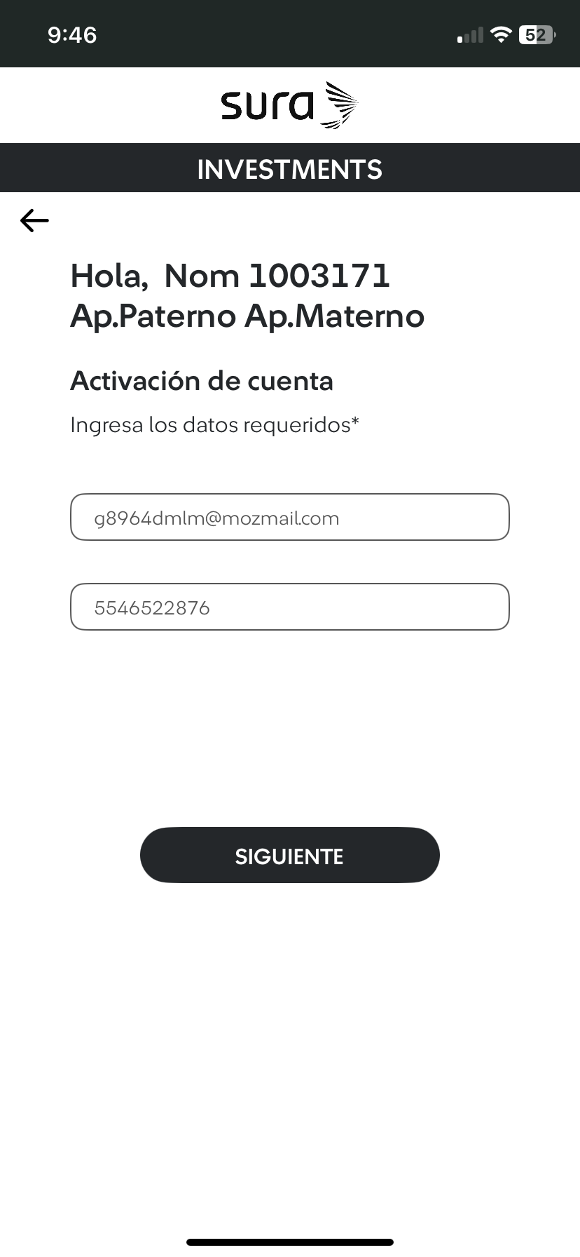 6 Ingresa tu número celular y correo electrónico, luego haz tab en el botón "Siguiente". |