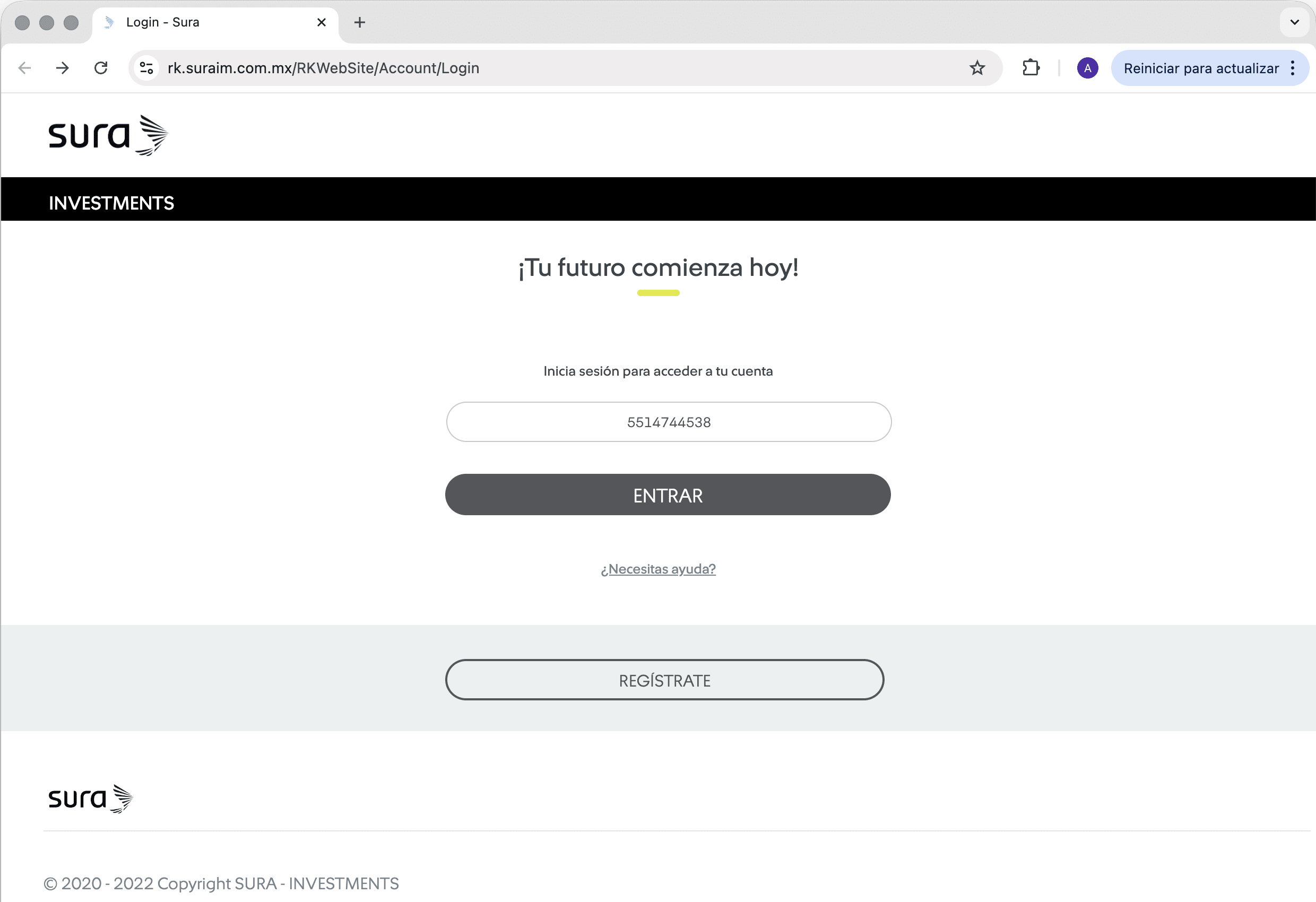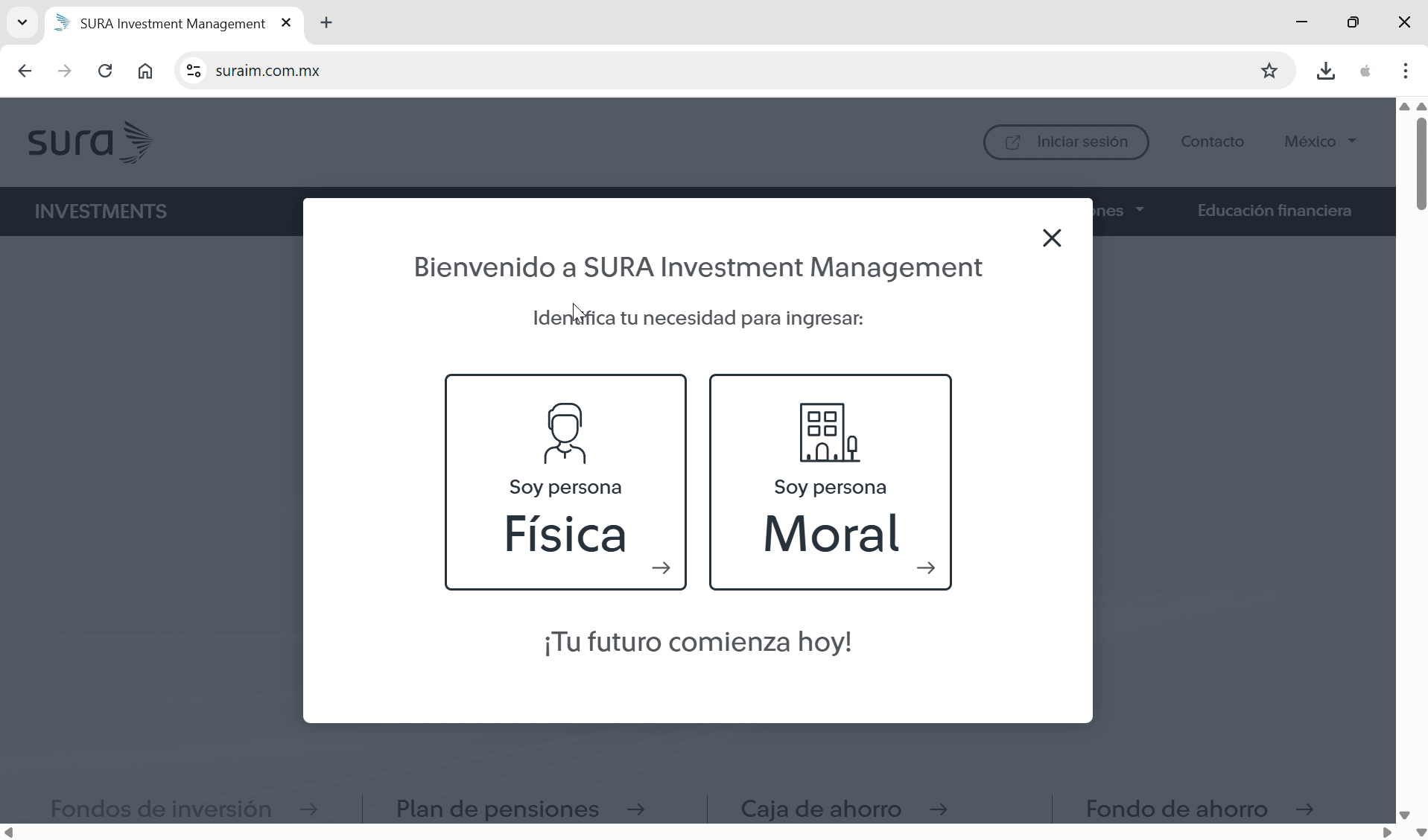 | 1 Ingresa al siguiente link https://www.surainvestments.com/mx/corporate-solutions y da clic en "Ingresar". ![]() | 2 Clic en "Soy persona física". ![]() |