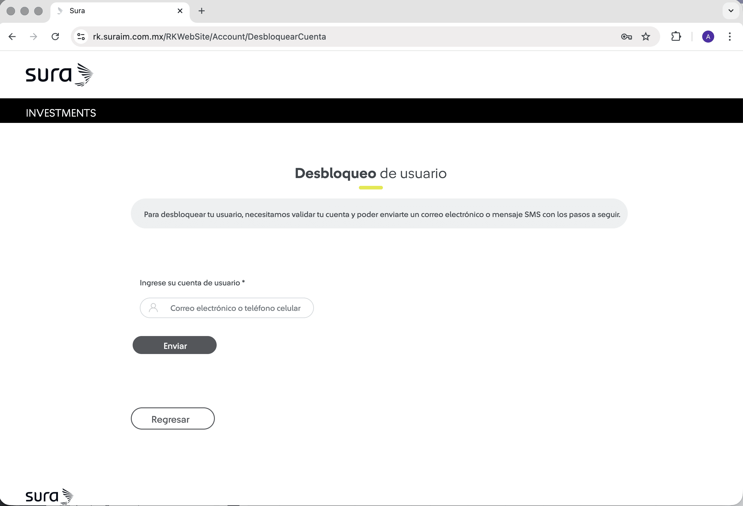 | 3 Clic en el botón "Desbloquear cuenta". ![]() Tip: Solo aplica para bloqueos por intentos fallidos de contraseña. | 4 Ingresa tu usuario de correo o teléfono celular, luego haz clic en el botón "Enviar". ![]() |