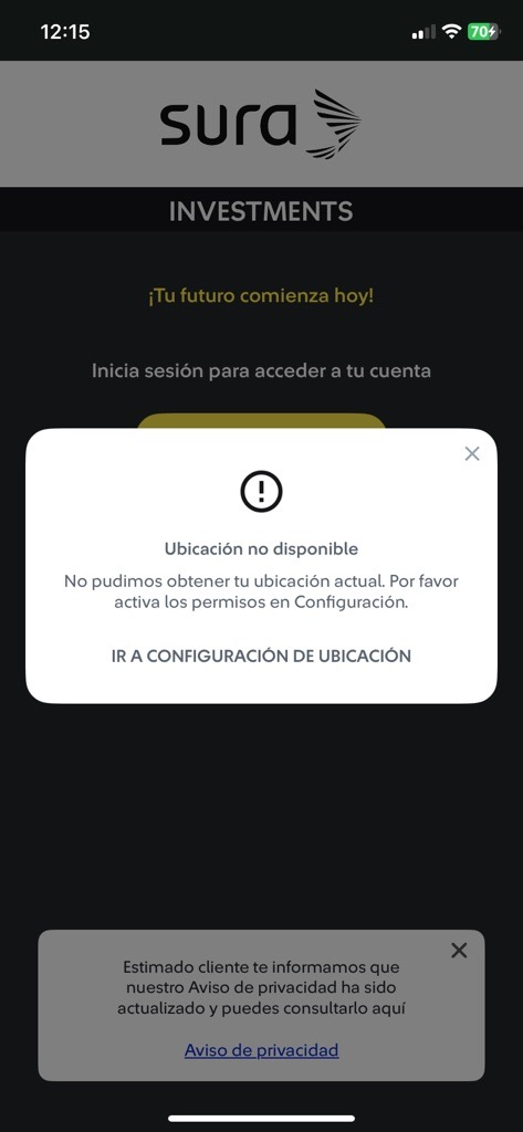 | 1 Al crear tu cuenta, tu dispositivo te pedirá permiso para acceder a tu ubicación. Para continuar con el registro, selecciona la opción “Permitir al usar la APP”. Con esto podrás avanzar sin inconvenientes. Si elegiste “No permitir” o “Permitir una vez”, puedes seguir los pasos indicados en esta sección para habilitar nuevamente los permisos de ubicación. ![]() | 2 Si te aparece el siguiente mensaje "Ubicación no disponible", deberás dar tab en "Ir a configuración de ubicación". ![]() |